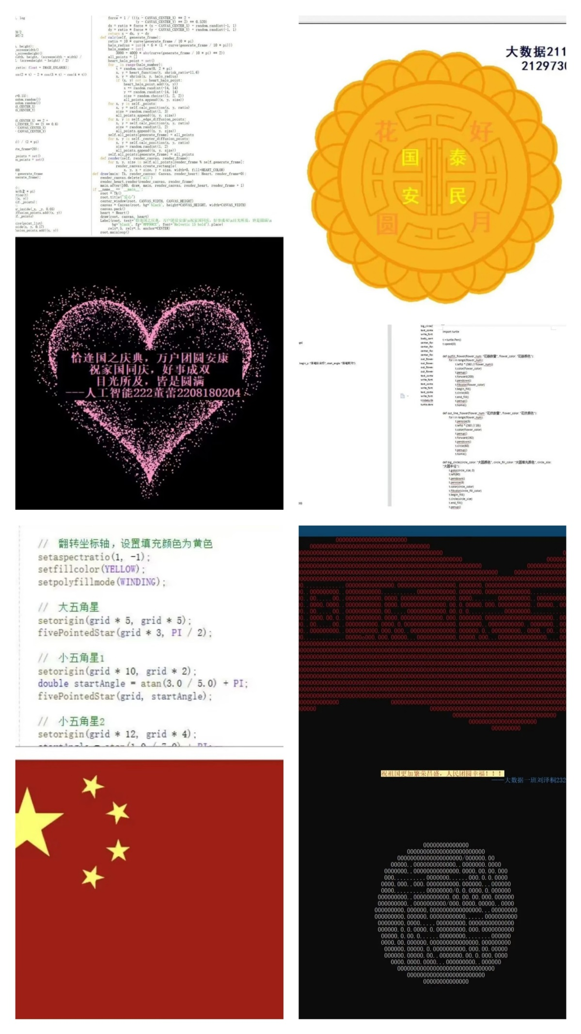 此次活动,学院广大学子积极响应,用“三行代码”谱写出独属于理工科的浪漫情诗,深情告白祖国。这彰显了同学们的专业技能与特色,同时用三行代码浪漫地诉说“生在红旗下,长在春风里”的骄傲与自豪。数科学子通过这别开生面的表白方式,向祖国献上了最真挚的祝福与热爱:愿山河无恙,祖国繁荣昌盛。