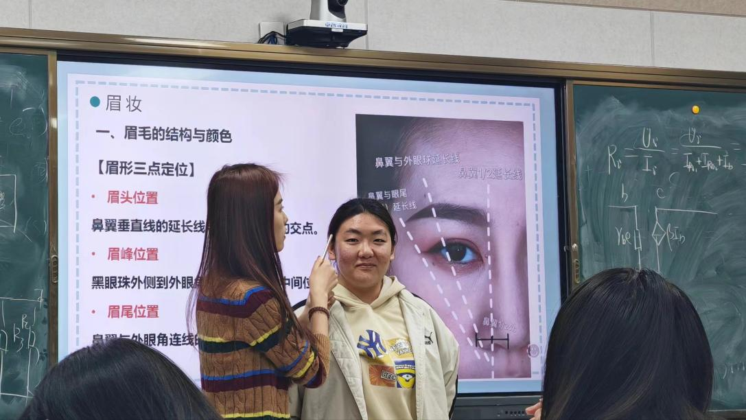 本次课程分为理论学习和课堂实践两部分。在理论学习中,老师系统讲解了化妆品种类、皮肤状况、妆容类型及应用场景等。课堂上,老师邀请同学共同参与授课,演示如何展现不同妆造,分享化妆细节的技巧。