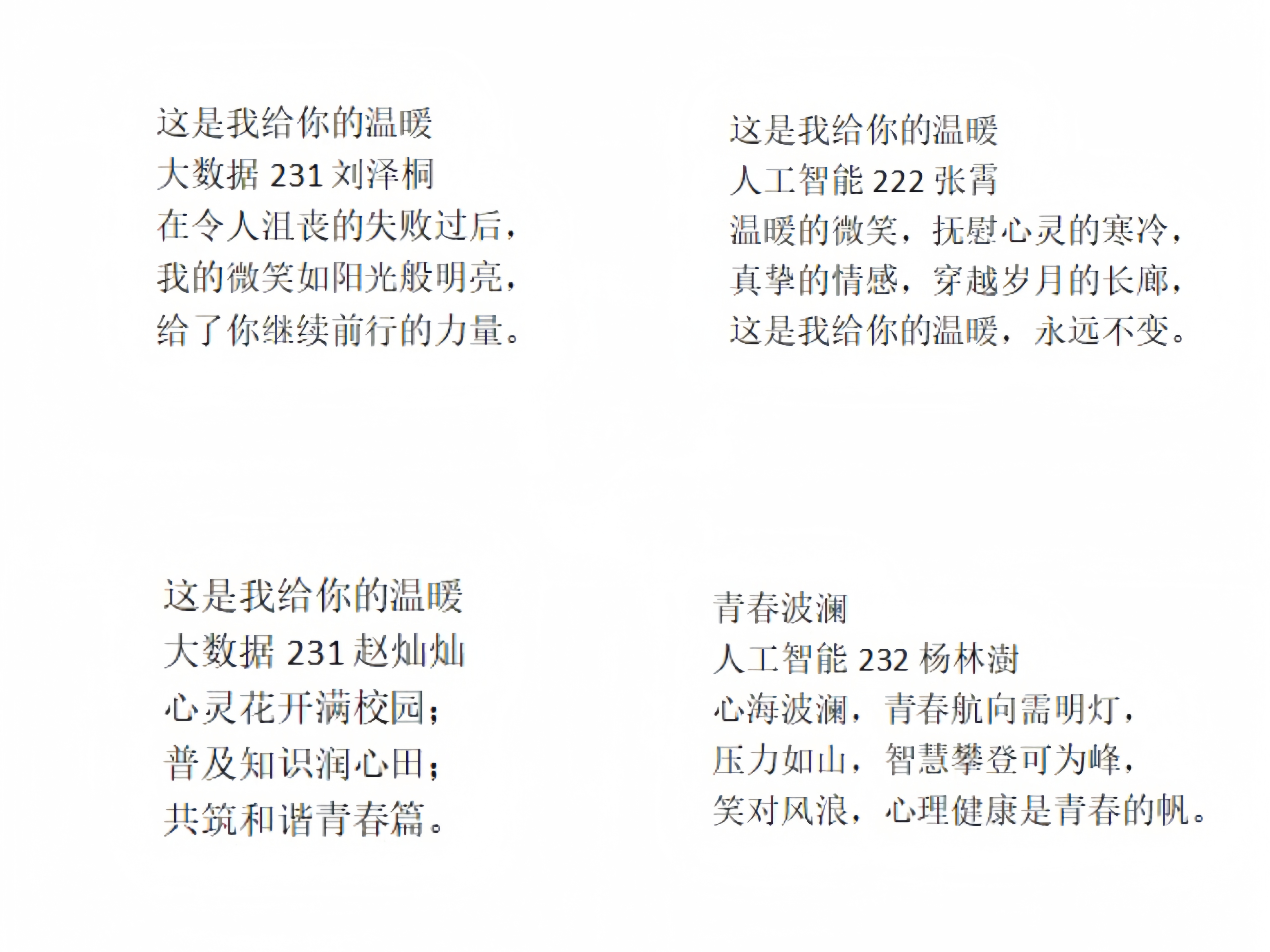 此次活动吸引了众多热爱文学、关心心理健康的同学们积极参与。同学们以三行诗的形式,用简短的文字表达了对友情、爱情、亲情等美好情感的感悟,以及对生活的热爱和对未来的憧憬。每一首诗都如同温暖的阳光,照亮了同学们的心灵,传递出积极向上的能量。评选团对提交的作品进行了认真评审,最终评选出了优秀作品进行展示。这些作品不仅语言优美、情感真挚,而且富有创意和想象力,展现了同学们独特的文学才华和深刻的生活感悟。