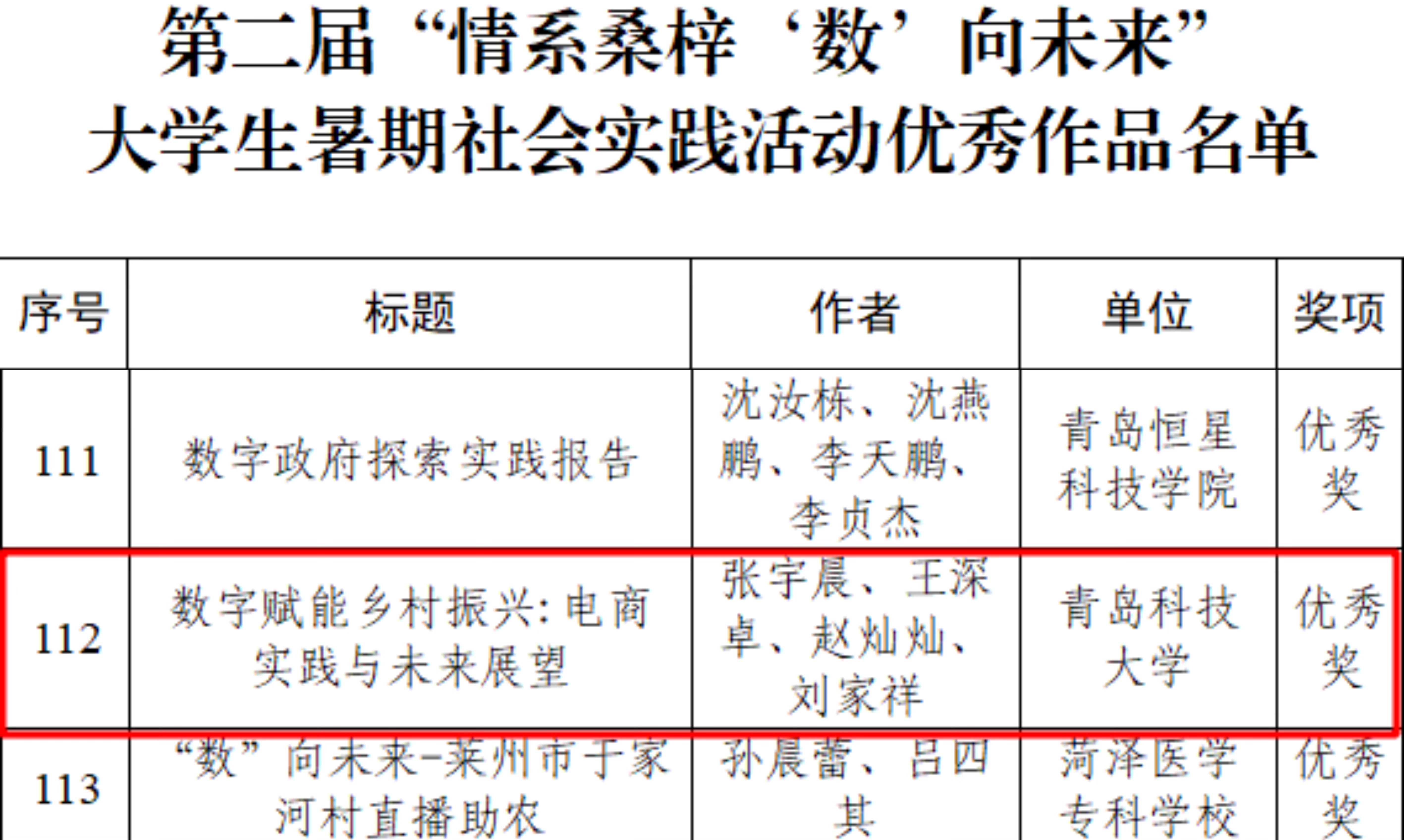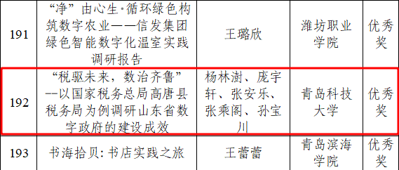 此次活动以“情系桑梓‘数’向未来”为主题,活动开展以来,得到了各市学生的广泛关注和积极响应,经专家评选和审议,最终确定获奖作品200个、优秀组织单位22家,优秀指导教师165名。kaiyun开云官方辅导员卞文馨获优秀指导教师荣誉称号,《数字赋能乡村振兴:电商实践与未来展望》《推动智慧政务与数字化城市管理:实践与探索》《税驱未来,数治齐鲁——以国家税务总局高唐县税务局为例调研山东省数字政府的建设成效》三项调研作品荣获优秀奖。调研作品深度结合习近平总书记关于网络强国、数字中国建设的重要论述,通过为期四到五周的数字化服务活动,围绕“数字+”领域对数字化建设成效进行总结并提出有关建议。