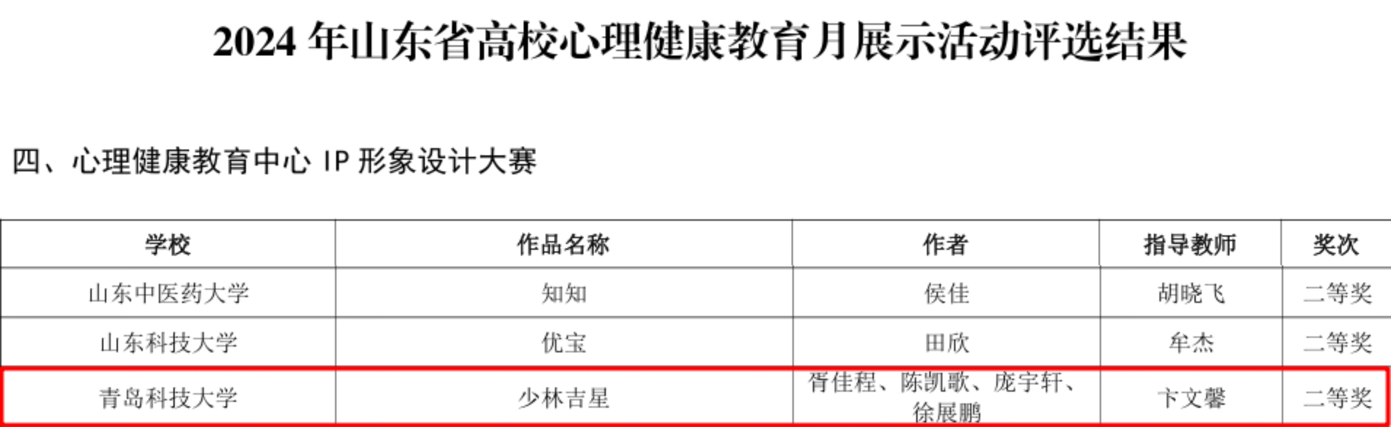 近日,山东省高等学校思想政治教育研究会、大学生心理健康教育专业委员会公布了2024年山东省高校心理健康教育月展示活动评选结果,kaiyun开云官方《少林吉星》获得心理健康教育中心IP形象设计大赛二等奖。