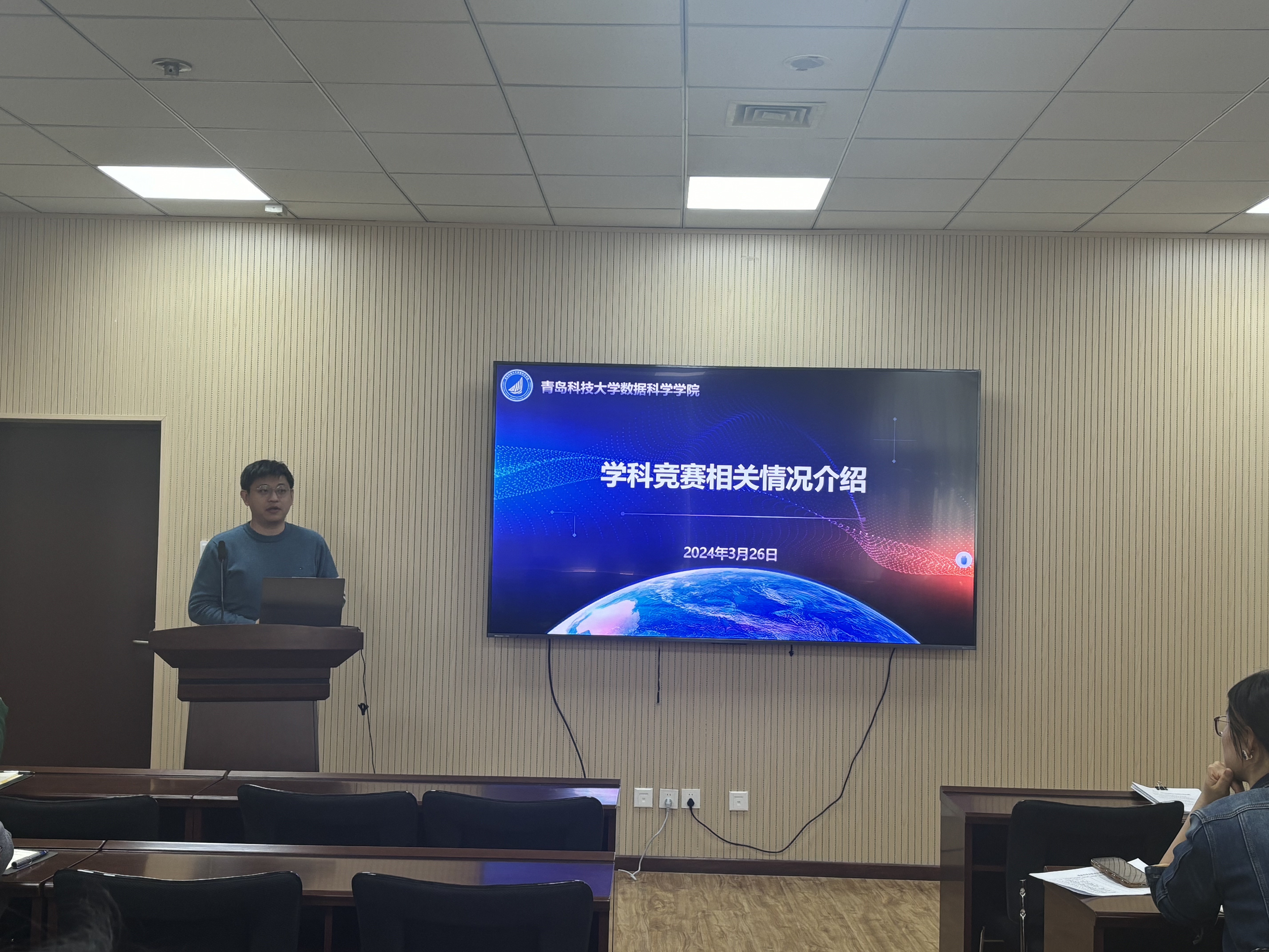 辅导员姜国华对学科竞赛的具体内容、参赛要求和注意事项进行了介绍,从队伍梯队化、结构健康化、项目多样化方面介绍了学生科创队伍建设。